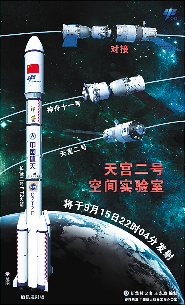 天宫二号计划9月15日发射,神舟十一号载人飞船则将于10月中下旬升空。