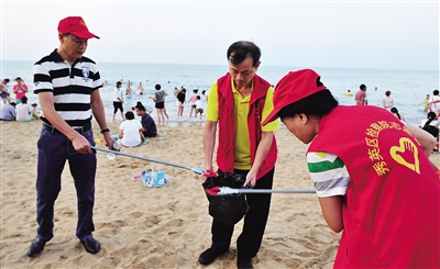 中秋小长假期间,由学生、共青团员和海口市各级政府人员组成的“双创”保洁志愿者,活跃在海口的大街小巷和各大旅游景点。图为志愿者在假日海滩捡垃圾。 本报记者 古月 摄