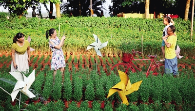 9月16日,市民在海口琼山区龙塘镇香世界庄园游玩、赏花、垂钓,品尝当地特色农家菜。 据了解,截至中秋小长假第二天,海口市节假日游客接待量增长明显,周边农庄游受到青睐。 本报记者 张茂 摄