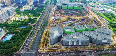 目前整个项目外部LED屏幕、幕墙玻璃已安装完成,正在进行内部精装修及园林种植等工程。 本报记者 张茂 摄