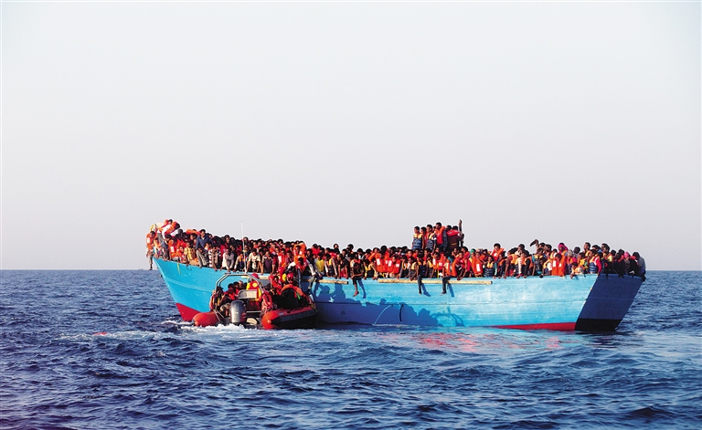 图为在利比亚地中海沿岸,一只西班牙救援船靠近超载的难民船。