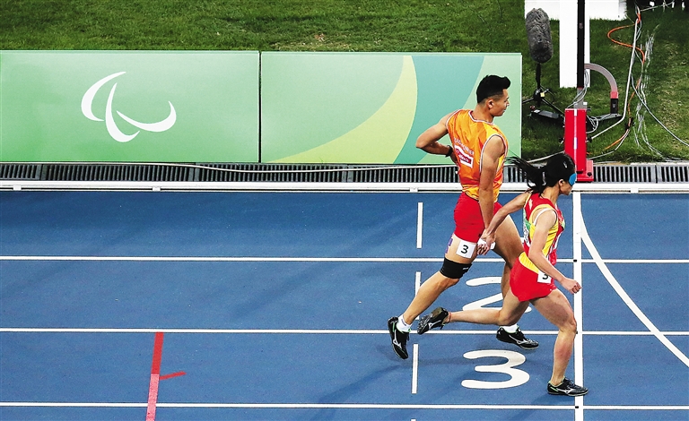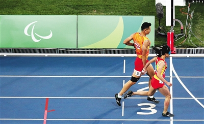 田径赛场上,世锦赛4金与亚残运会5金获得者刘翠青在陪跑员徐冬林的引领下,在女子T11级400米比赛中第一个冲过终点线,摘得她残奥会参赛经历中的第一枚个人项目金牌。