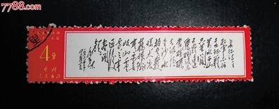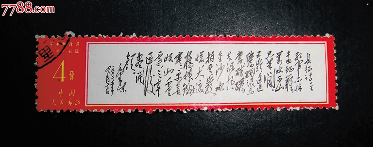 毛泽东的长征诗词邮票。1968年5月1日发行的编号为“文7”(14-5)邮票,内容是毛泽东诗词《忆秦娥·娄山关》,展示出毛泽东为庆贺“娄山关大捷”即兴创作出的诗词全文。邮票“文7”(14-9)内容为毛主席长征途径六盘山时写的诗词《清平乐·六盘山》。邮票“文7”(14-8),是毛泽东诗篇《七律·长征》。
