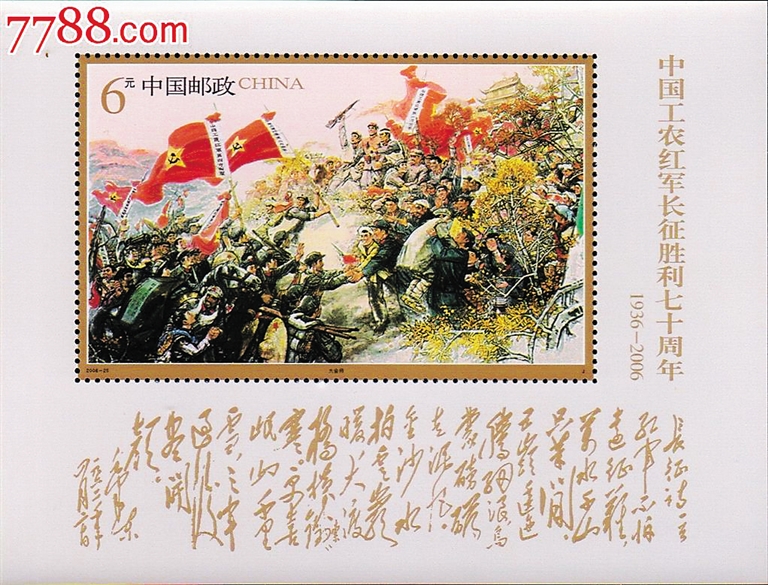 2006年10月22日,《中国工农红军长征胜利七十周年》纪念邮票发行,全套邮票4枚、小型张1枚。这套邮票根据国内5位著名画家的名作设计制作,它选取了红军长征开始时的《送别》和长征中的《遵义会议》《飞夺泸定桥》《过草地》《大会师》这些具有代表性的重要事件和重要场景,艺术地呈现了长征这一部英雄史诗和千古绝唱。小型张《大会师》画作的下方是毛泽东诗词手迹《七律·长征》,这既是红军长征的总结与颂歌,又是这套邮票的一个归纳,表述了长征路上的种种艰难险阻,饱含着中国共产党和革命军人的豪情壮志。