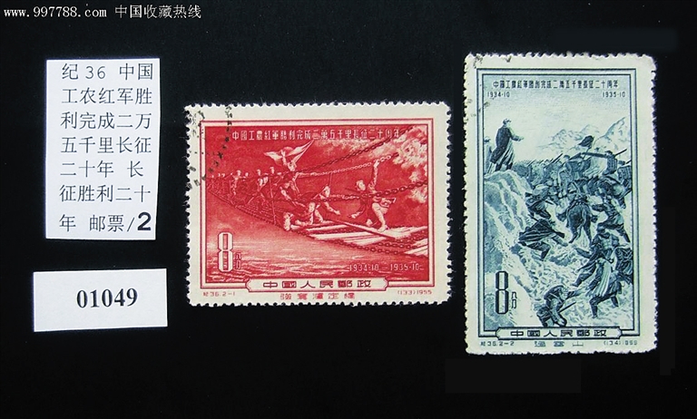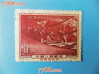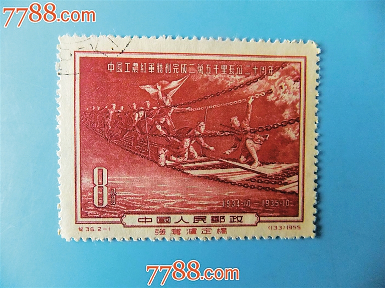1955年12月30日,为纪念红军长征胜利20周年,国家邮电部发行了一套编号为纪36的《中国工农红军胜利完成二万五千里长征二十周年》纪念邮票,该套邮票2枚,图案分别为“强夺泸定桥”和“过雪山”,这是首次发行纪念红军长征的邮票。“强夺泸定桥”是著名画家李宗津的画作,其画面形象生动地描绘了红军勇士踩着泸定桥上悬空的铁索,冒着敌人的枪林弹雨奋勇前进的壮烈情景。整个画面色泽呈暗红色,反映着红军战士在血与火的恶劣环境中舍身战斗。“过雪山”是著名画家黄丕星的画作,其画面反映了在革命领袖毛泽东的率领下,红军战士艰难翻越大雪山时的英勇气概。整个画面色泽呈铁青色,既与风雪交加的现实环境相似,又与严峻的政治形势吻合。