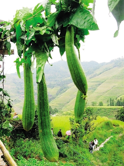 盛夏或初秋,菜市上大致有三种不同形状的丝瓜。一种细长圆筒状,表皮有茸毛,皮儿绿色间有深绿色条纹,无棱,像棒槌,这是北方人常说的“棒槌丝瓜”。一种呈纺锤状,皮儿有皱纹但无茸毛,表皮稍硬,有棱且以八条棱者居多,这是从南方引进的“棱丝瓜”“八棱丝瓜”。还有一种长达一两米、研发年代不久的蛇形丝瓜,谓之“蛇丝瓜”,与上述两种丝瓜同科不同属,因其形体特殊,也成为了一种观赏植物。
