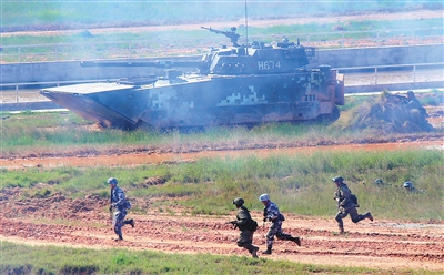 中俄海军陆战队混编陆战分队对岛礁防御之敌,进行进攻战斗战术综合演练。 新华社记者 查春明 摄