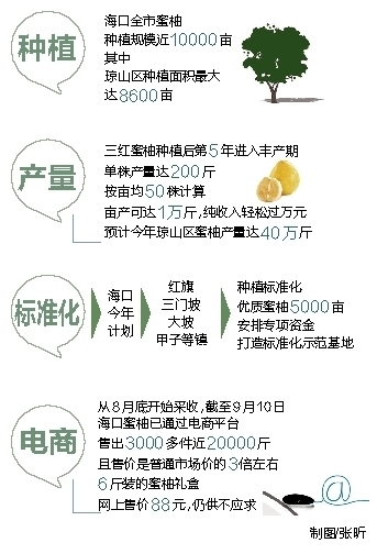 自2005年由合作社连片种植350亩以来,海口全市蜜柚种植规模至今已近万亩。其中,种植面积最大的琼山区达8600亩,辖区红旗、云龙、大坡、甲子、旧州、三门坡等镇均有较大面积的种植基地。
