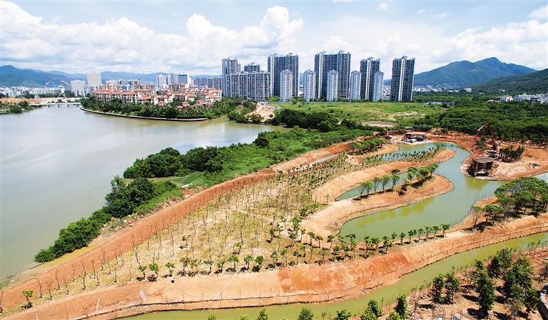 三亚红树林生态公园正在抓紧时间施工,工人们正在平整土地、栽种树木。据了解,红树林生态公园工程建设主要包括河道整治、红树林补种、园林绿化等工程,新增海绵体、坑塘等。目前,一期120亩示范段工程已进入收尾阶段,预计国庆前完工。本报记者 武威 摄