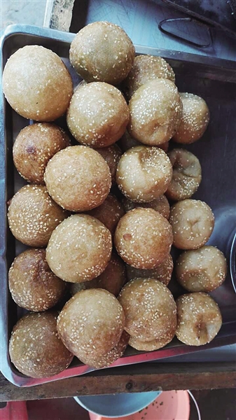 在临高街边小吃除了韭菜饼外,还有煎堆不得不提。煎堆皮用糯米粉做原料,里料一般为红糖、椰丝、红枣、花生等。煎堆也是和韭菜饼一样放入油锅中炸制而成,可谓是韭菜饼的同胞兄弟。