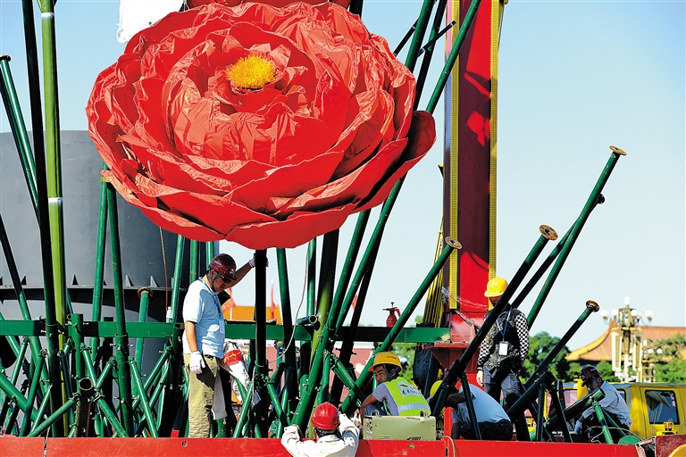 9月19日,工人们在天安门广场安装“祝福祖国”巨型花坛。 当日,2016年国庆节天安门广场“祝福祖国”中心主花坛开始吊装。据介绍,花坛高度达17米、篮体高15.3米、直径50米,其内扦插300多枝仿真花,花材以牡丹、玉兰、荷花、月季为主,篮体镶嵌有“祝福祖国”和“欢度国庆”文字及1949至2016的年号,表达对祖国的美好祝福。花坛施工预计周末结束。 新华社发
