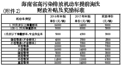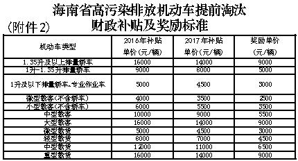 八、实施高污染排放机动车提前淘汰补贴奖励机制。在原有黄标车提前淘汰财政补贴标准的基础上,对各类高污染排放机动车提前淘汰实施奖励,奖励时间从2015年实施补贴之日起至2017年6月30日止(补贴及奖励标准见附表2)。奖励资金仍按省级和市县3∶7的比例分担。(责任单位:各市县政府;配合单位:省财政厅、省生态环保厅、省公安厅、省商务厅)