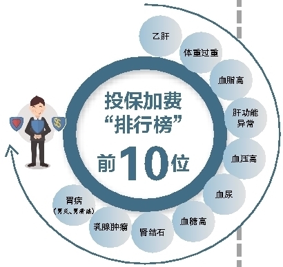 投保加费“排行榜”显示,排在前10位的加费原因分别是乙肝、体重过重、血脂高、肝功能异常、血压高、血尿、血糖高、肾结石、乳腺肿瘤、胃病(胃炎、胃溃疡)。其中,乙肝、体重过重、血脂高、肝功能异常前4位占到80%以上的比例,乙肝一项超过30%。拒保原因前十的因素与加费因素大体一致,只是程度不同。