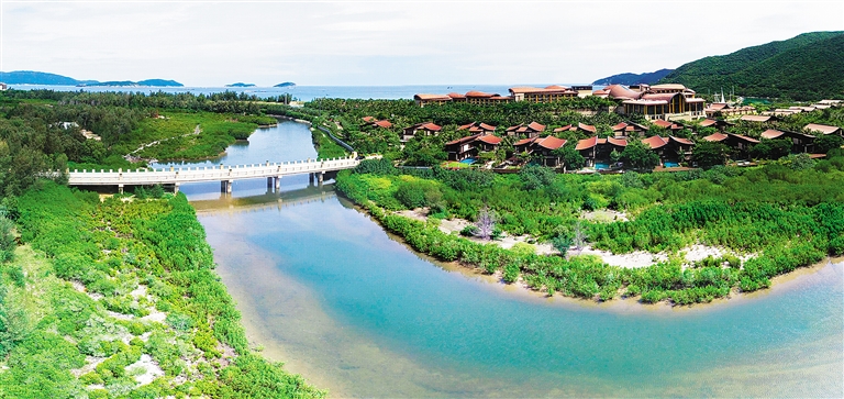 9月21日,俯瞰三亚青梅港红树林湿地保护区,绿意盎然。据介绍,红树林湿地保护区修复工程是三亚市“双修”“双城”建设项目之一,内容主要分为红树林湿地保护与修复两个方面,并对红树林次生林、残次林进行改造。目前,修复造林工程已经完成,共计补种红树苗约7万株、补种面积35.8亩,已进入养护阶段。本报记者 武威 摄