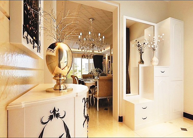 玄关通常与客厅或餐厅相连,但与厅的功能有区别,所以要通过装饰设计进行功能分区。通常采用的方法主要是吊顶、墙面装饰、地面的材料和色彩等区分或用门套、挂落、屏风、柜子等隔断。