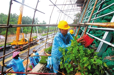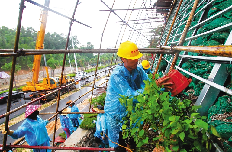 9月22日,在三亚市凤凰路,工人们正冒雨在金鸡岭边坡山体上种植草皮和三角梅。三亚市凤凰路景观提升工程中,为扩建非机动车道开挖了数处山体表面,目前正在对这些山体进行绿化、美化施工。整个凤凰路景观提升工程将在国庆前竣工。 本报记者 武威 摄