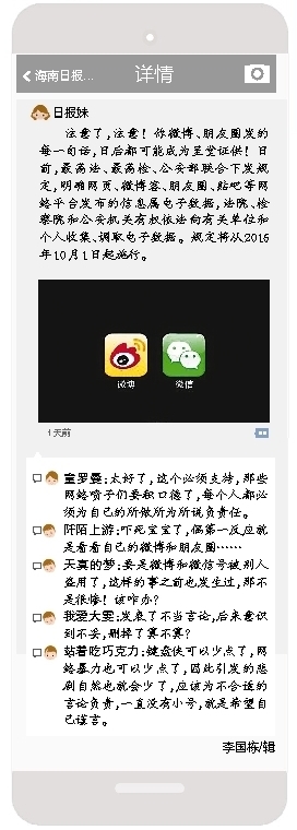 注意了,注意!你微博、朋友圈发的每一句话,日后都可能成为呈堂证供!日前,最高法、最高检、公安部联合下发规定,明确网页、微博客、朋友圈、贴吧等网络平台发布的信息属电子数据,法院、检察院和公安机关有权依法向有关单位和个人收集、调取电子数据。规定将从2016年10月1日起施行。