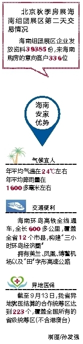 金秋九月,天高云淡。在这收获的时节,有“楼市第一展”美誉的北京房地产展示交易会正在北京展览馆如火如荼地进行中。今天上午,记者在展馆走访发现,海南组团展区是整个展览馆最为热闹的区域之一。不少北京市民围坐在房产项目展示区咨询,房企工作人员忙着为其讲解。当日,海南组团展区企业发放资料39385份,来海南购房的意向客户336位。