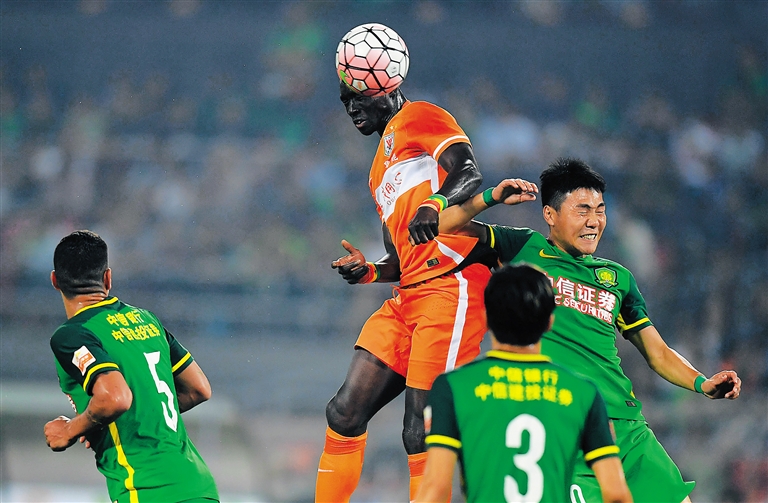 9月25日, 在2016赛季中超第26轮的比赛中,北京队主场1:2负于山东队。图为山东队球员西塞(左二)头球攻门。 新华社发