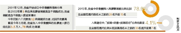 2015年,我省中华骨髓库入库愿意捐献比例达到78.9%,在全国范围内排名从之前的29名升至15名,而入库随访中,“拒捐+犹豫+拒捐回访”比例也降至4.1%,在全国范围内比例从低到高排名也从之前的30名提升至第7名。