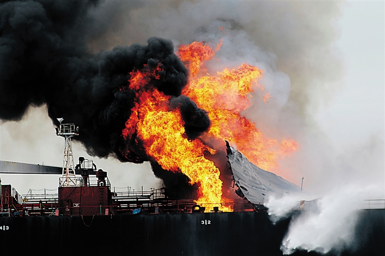 9月24日,在墨西哥韦拉克鲁斯州博卡-德尔里奥附近的海域,失火油轮冒出滚滚浓烟。 当天,墨西哥石油公司的油轮布尔戈斯号在博卡-德尔里奥附近海域爆炸起火,幸未造成人员伤亡。 新华社/路透