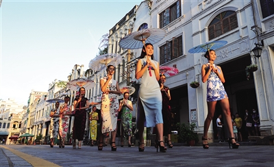 9月26日下午,《中国旗袍》MTV摄制组正在海口骑楼老街取景拍摄。据了解,海口骑楼老街是不少来海口旅游外地人必看的景点之一,目前也成为一些电影电视摄制组的取景地,几乎每周都有摄制组、摄影爱好者到骑楼老街取景拍摄。本报记者 古月 摄