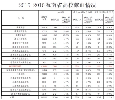 各高校也积极开展校园内的无偿献血志愿宣传活动。海南师范大学青年志愿者协会2011年开始开展“热血注心田”志愿服务活动,每年制定各学院详细的无偿献血工作计划,并组织各班级积极开展以无偿献血为主题的活动,将无偿献血知识传播给每一位学生,在校园内营造了无偿献血的良好氛围,树立了“人人为我、我为人人”的奉献理念。