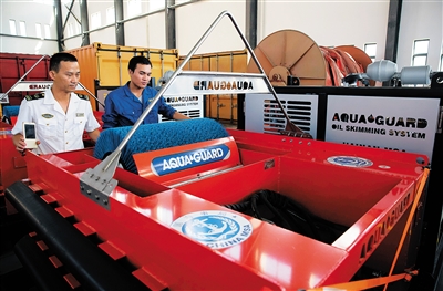 9月27日,海口海事局执法人员在海事溢油应急资源库内检查一台水上收油机的设备状况。海口海事局辖区目前共有12家单位配备了溢油应急资源库。刚刚上线的海口海域海上溢油应急指挥系统是针对现有应急资源,通过应用移动互联网技术,构建一套科学防污管理体系,使用者通过手机客户端可随时查询辖区内防污应急资源资料。本报记者 宋国强 通讯员 王文光 陈雷 摄