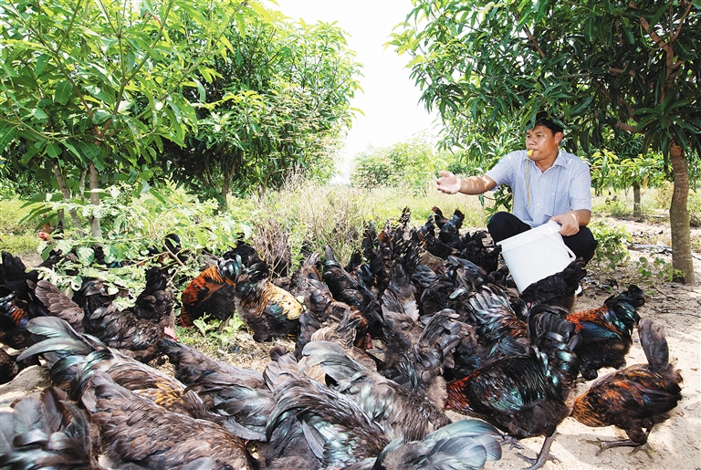 9月28日,陵水黎族自治县文罗镇五星村,五星新型农民种养专业合作社发起人董儒林在给养在芒果林里的五黑鸡投食。