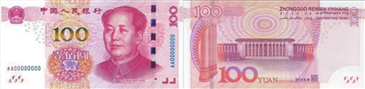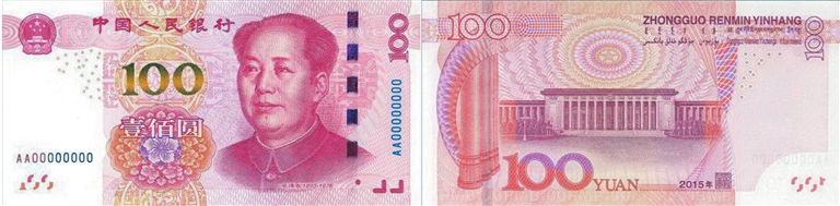 光变镂空开窗安全线:位于票面正面右侧。垂直票面观察,安全线呈品红色;与票面成一定角度观察,安全线呈绿色;透光观察,可见安全线中正反交替排列的镂空文字“¥100”。