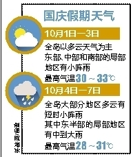 本报海口9月29日讯 (记者叶媛媛 通讯员符晓虹 翁小芳)十一国庆七天长假即将来临,记者今天上午从省气象台了解到,国庆假期,我省气温适宜,前期风和日丽,中后期阵性降水增多,总体天气较好,有利于出行和进行各种户外活动。