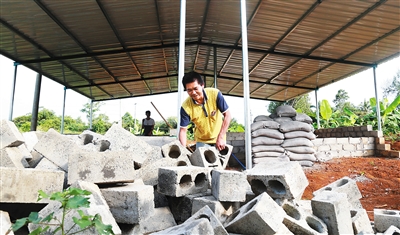 10月1日,海口市三江镇眼镜塘村,贫困户王强在政府帮扶下修建猪圈,希望通过养猪脱贫。