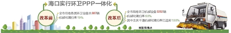 海口自去年7月18日开始实施环卫PPP一体化改革,如今四个区的主城区已全部推行完毕,京环公司、京兰公司、玉禾田公司、龙马公司分别接手四个区的环卫工作,带来了大量社会资本对现代化环卫设备的投入。