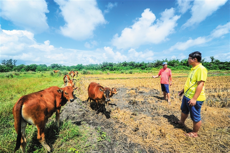10月4日,文昌市龙楼镇宝陵村,镇扶贫办工作人员在国庆假期下乡看望贫困户,在田间了解他们家的养牛情况。