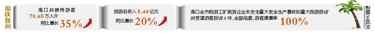海口市旅游委相关负责人告诉记者,这个国庆黄金周,生态游、文化游唱主角,自助游、自驾游、亲子游型游客成为市场主力军。国庆7天,海口共接待游客70.68万人次,同比增长35%;旅游总收入8.44亿元,同比增长20%。