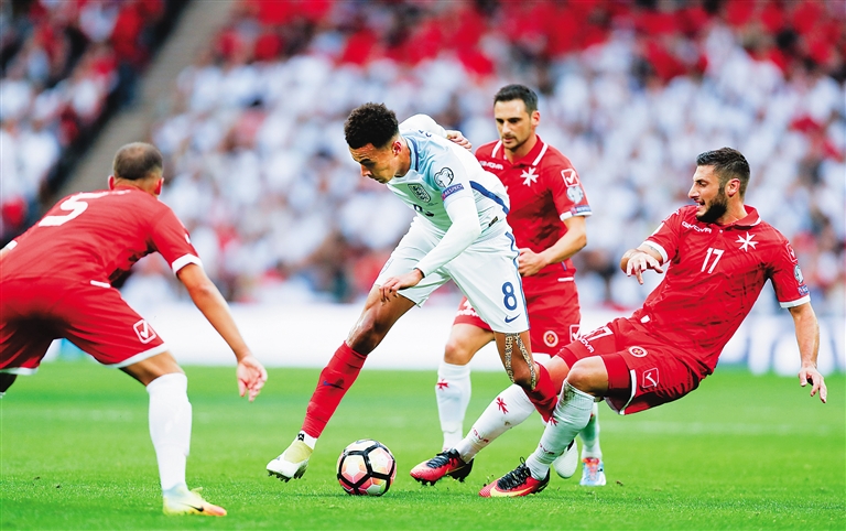 9日,在世界杯欧洲区预选赛比赛中,英格兰队2:0胜马耳他队。图为英格兰队阿里(左二)与马耳他队拼抢。新华社发