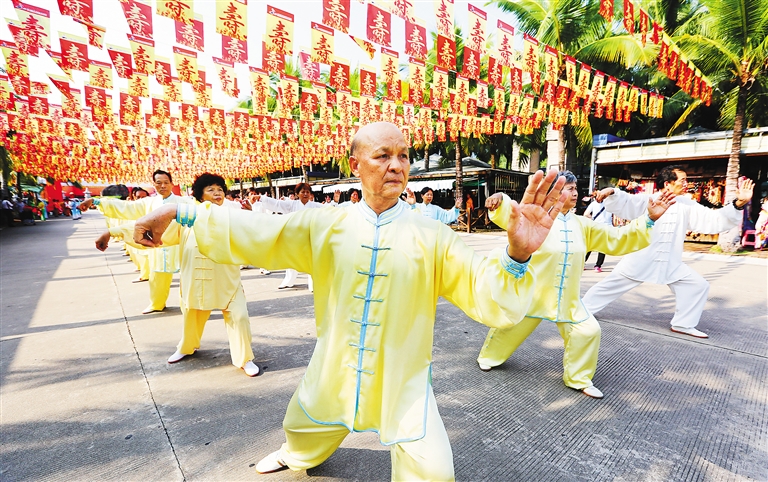 10月9日,“梵天净土 寿比南山——中国三亚2016南山长寿文化节”在三亚南山文化旅游区举办。获评“海南十佳健康长寿老人”“寿公寿婆”的长寿老人们齐聚南山,共度重阳互送祝福,和大家分享长寿“秘诀”。图为太极拳爱好者在文化节上表演太极拳。
