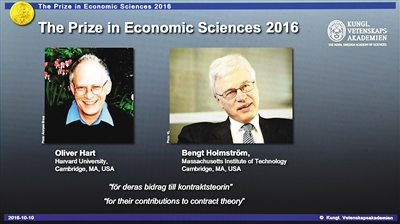 诺贝尔经济学奖评选委员会当天发表声明说,两名获奖者创建的新契约理论工具对于理解现实生活中的契约与制度,以及契约设计中的潜在缺陷十分具有价值。