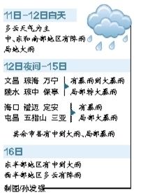 本报海口10月10日讯 (记者叶媛媛 通讯员符晓虹 翁小芳)记者今天从省气象台了解到,今年第19号台风“艾利”已于下午5时减弱为热带低压,即将在南海东北部海面减弱消失。预计12日夜间-15日,文昌、琼海、万宁、陵水、琼中、保亭等市县有暴雨到大暴雨、局部特大暴雨;海口、澄迈、定安、屯昌、五指山、三亚有暴雨、局部大暴雨,预计过程累积雨量100-200毫米;其余市县有中到大雨、局部暴雨,预计过程累积雨量50-100毫米。