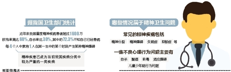 “没有精神障碍并不代表精神完全健康,事实上一个人一生中几乎不可避免地会出现精神卫生问题,最普通的例子如自卑,最极端的例子如自杀。”省安宁医院心理健康中心主任罗海东说,随着生活压力的不断增大,很多人都处在心理亚健康状态。