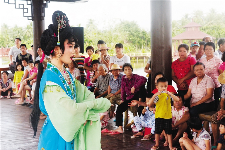 10月2日,琼海市塔洋镇的乡村公园,孩子们为乡亲表演琼剧。当地常年开设琼剧培训班,吸收年龄在7岁—11岁之间小学员,从小培养琼剧爱好者,为琼剧表演培养后备人才。特约记者 蒙钟德 摄