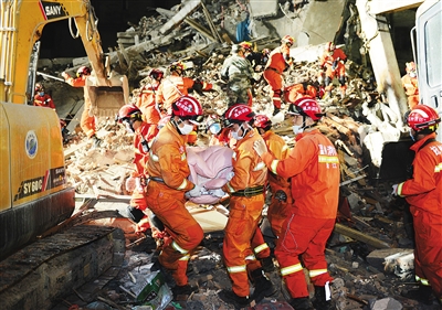 10月10日深夜,救援人员抬出遇难者遗体。 记者10月11日凌晨从温州市鹿城区相关部门获悉,鹿城区双屿街道民房倒塌现场救援工作已基本结束,目前事故共造成22死6伤。 新华社发