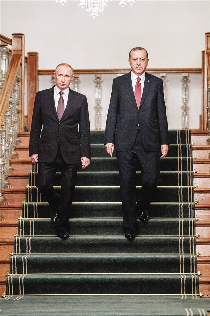10月10日,在土耳其伊斯坦布尔,土耳其总统埃尔多安(右)和俄罗斯总统普京准备出席新闻发布会。 土耳其总统埃尔多安和到访的俄罗斯总统普京10日在伊斯坦布尔签署天然气管道建设项目协议。双方当天还讨论了叙利亚问题。