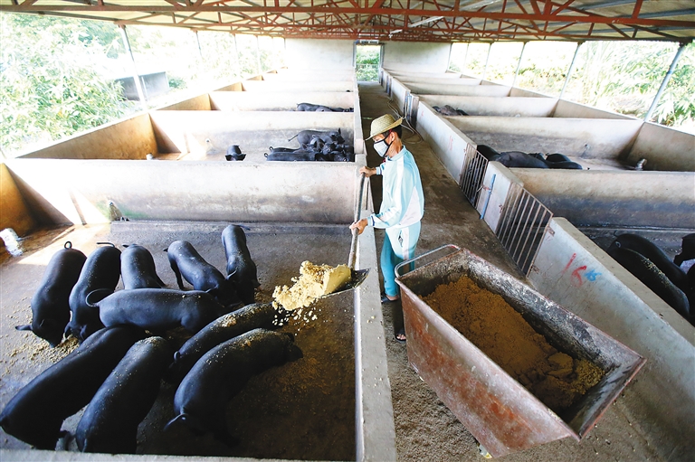 目前,南华养殖专业合作社出栏的定安黑猪已经打入了深圳、佛山、广州、中山等城市,甚至要开拓香港、上海市场,从规模扩张跳跃到抓品质的阶段。所以现在合作社已经不是一般的合作社了,而是要保障定安黑猪的品质。除了那种传统的饲料养殖,合作社需要探索一种新的模式,保证黑猪的品质不变。这需要在几个方面做文章,第一是饲料配比,合作社种牧草,加自己配的饲料,保证黑猪的肉质;第二,黑猪的病害防疫上,有专业的管理,保证品质;第三,定安黑猪在出售前要经过合作社的检验之后才能卖出去,再一次把握住了品质。