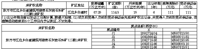 七、风险提示及其他事项。1、矿业权存在不可预见的自然因素变化、政策法规变化等风险,竞买人在竞买前应当预见到有一定的风险,在竞得后须自行承担风险所带来的损失。2、涉及到林业、土地使用、安全生产、环境保护等有关事项,由竞得人按有关法律、法规规定执行。竞得人须自挂牌成交之日起3个月内与矿区的土地使用权人签订合法土地租赁合同(租赁合同须经矿区所在地乡镇人民政府同意,其中采矿及生产经营用地不得占用耕地),并解决矿区范围内青苗、地面附着物的补偿问题,避免因土地纠纷而不能开发利用,确保石场于挂牌成交之日起6个月内开工投产。3、东方市国土资源局定于2016年10月18日组织矿区现场踏勘及答疑,有意竞买者请于当日上午9:00时前到该局集合(地址:东方市二环南路国土资源局,电话:25583677,联系人:刘先生)。4、本次挂牌出让事项如有变更,届时以变更公告为准。5、本次挂牌出让不接受电话、信函、电子邮件及口头竞买申请。