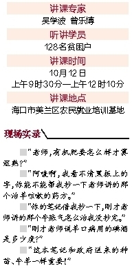 “大家早上好,你们是想听我用海南话还是普通话讲课?”“海南话!”10月12日上午9时30分,海口市美兰区农民就业培训基地的多功能教室里,来自大致坡镇的128名贫困户学员齐声回答着。美兰区精准扶贫种养技术培训班一开课,讲授瓜菜种植技术的农技专家吴学波“接地气”的开场白得到了学员们的热烈回应。