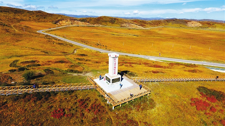在辽阔的日干乔大沼泽上,红军过草地纪念碑在阳光的照耀下巍然矗立。