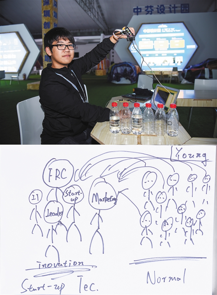 10月12日,深圳本土“小创客”吴子谦展示他带来的作品——产品库存感应仪,今年19岁的他已经申请了40多项专利。 2016年全国大众创业万众创新活动周正在全国各地开展,作为主会场的深圳吸引了来自全世界的创客和创新爱好者。