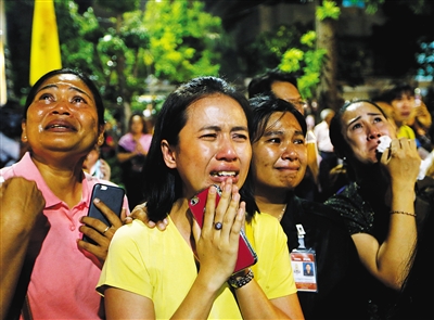 普密蓬国王病重期间,大批泰国民众自发聚集在曼谷诗丽叻医院门口为国王祈福,不少人在祈福过程中激动落泪。