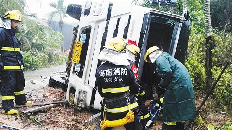 10月13日,因雨天路面积水湿滑等原因引发了几起事故。其中,当天上午7时30分,琼海市中原镇仙寨村内发生一起水泥罐车由于暴雨天气路面湿滑侧翻,驾驶人被困。经抢救无效死亡。当天上午11时28分,在海文高速演丰镇路口往机场方向1.5公里处,一辆中型货车由于路面湿滑,刹车之后不慎俯冲下桥,致三人被困。事故造成三人不同程度受伤。